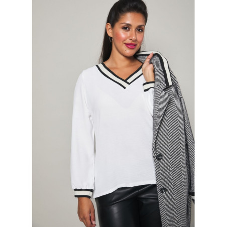 Blusa blanca de manga larga con escote en V adornado con ribetes bicolor en negro y blanco. Presenta un diseño suelto y fluido que aporta comodidad y movimiento, con pequeñas aberturas laterales en el bajo para un ajuste relajado. Los puños repiten el detalle de las franjas en contraste, añadiendo un toque deportivo y moderno. Ideal para combinar tanto con pantalones de vestir como con vaqueros para un look casual chic. Disponible en blanco y negro. ANVITO.