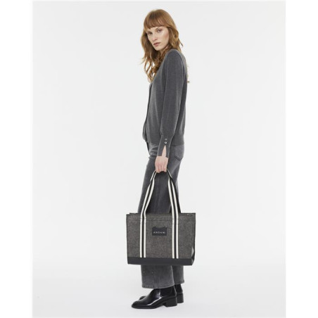 Bolso tipo tote en color gris con base en negro y asas de cinta en contraste blanco y negro que aportan un estilo moderno y casual. Incluye detalle frontal con parche de ANDAM, dando un toque distintivo y actual. Su diseño espacioso y resistente lo convierte en un complemento práctico y versátil, ideal para el uso diario o para completar looks urbanos con un aire contemporáneo. ANDAM.