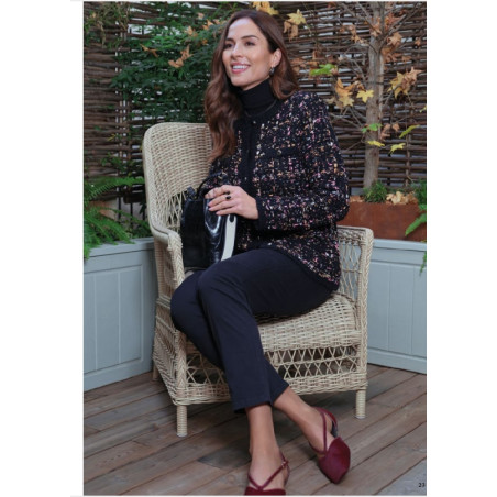 Chaqueta de punto tipo Channel en color negro con jaspeado multicolor. MCM.